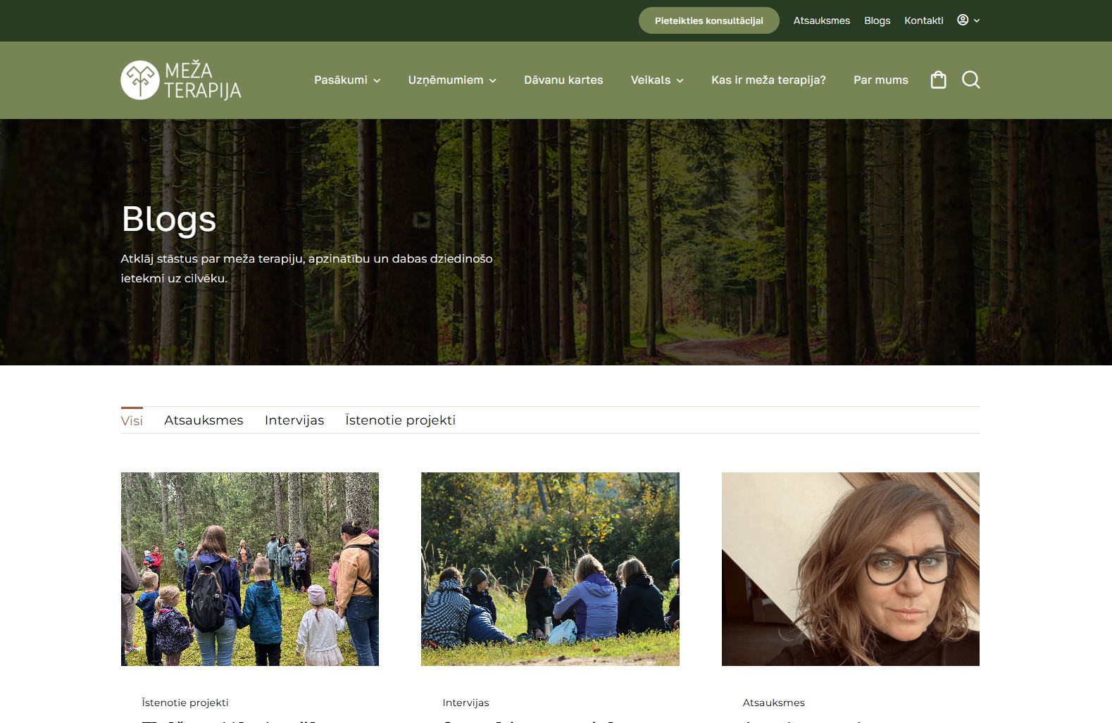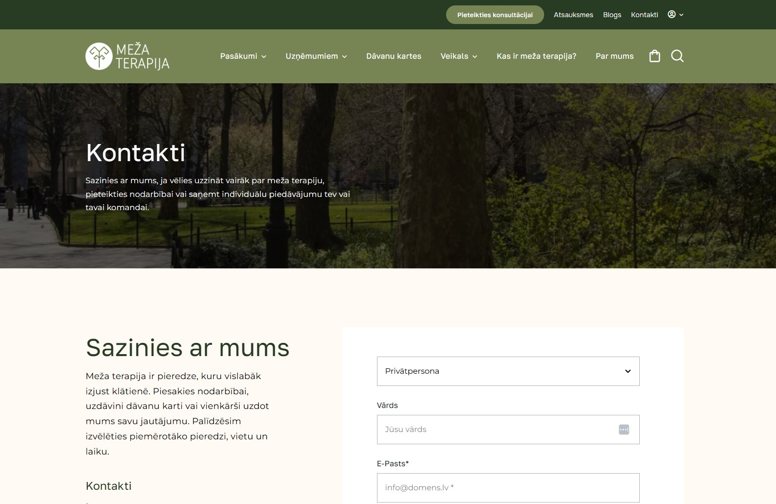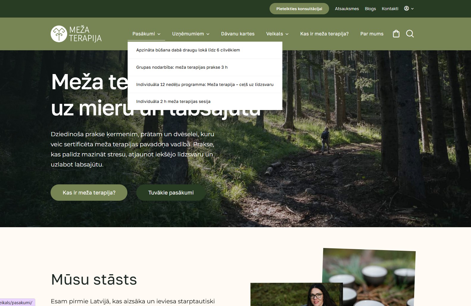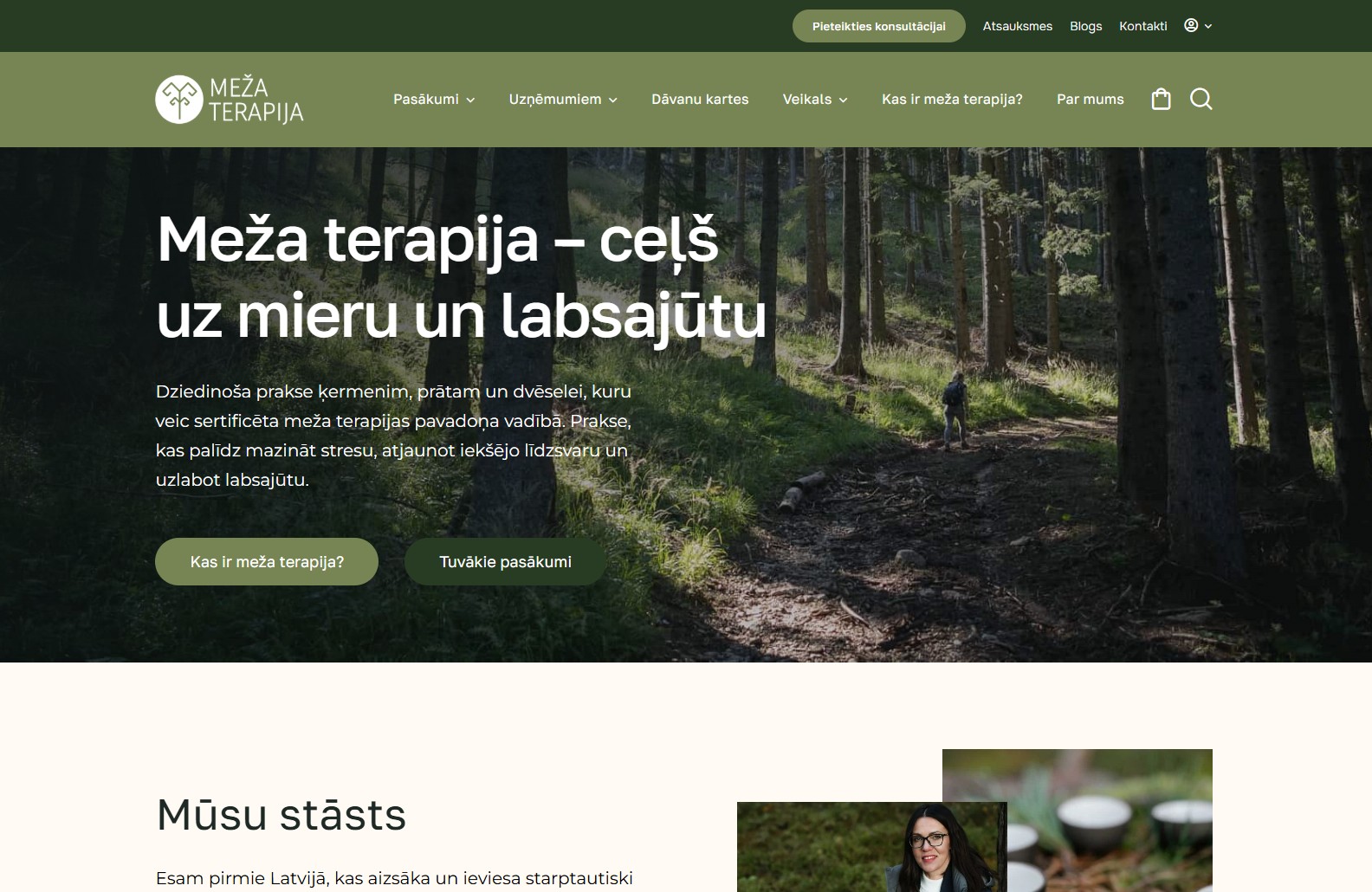Mājaslapas sākumlapa veidota kā skaidrs un mērķtiecīgs ievads pakalpojumu piedāvājumā, apvienojot estētiku ar funkcionalitāti. Mājaslapas dizainā tika organiski iekļauti koku motīvi, kas rada dabisku noskaņu un pastiprina zīmola vēstījumu un vizuālo identitāti, vienlaikus saglabājot profesionālu un nepārslogotu kopskatu.